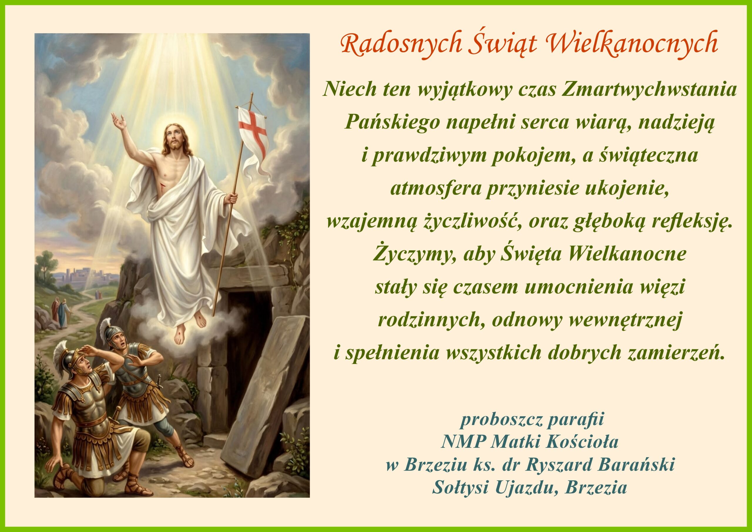 Niech Dobry Bóg przyniesie pokój w codzienności, radość w chwilach trudnych a blask Zmartwychwstałego Chrystusa prowadzi przez życie, dając zdrowie i błogosławieństwo do pokonywania wszelkich przeciwności.Parafianom i Gościom życzę Błogosławionych Świąt Zmartwychwstania Pańskiego!